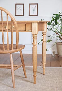 2016年11月06日 11月に入り、朝晩のがぐっと冷え込むようになりましたネ。実家では、早くもファンヒーターの登場で冬の気配。 秋は、すっとばされた? それでは、前回に続いてホワイトオークのご紹介。 すでに定着した感のある<スタンダード>ダイニングテーブルに上位モデルが登場。 主な仕様は、天板厚28㎜で引き出し付。ろくろ脚は85㎜角からの削りだし。 ○ホワイトオーク材 《プレミアム》ダイニングテーブル W1500/D850/H740 ¥208,000 W1650/D850/H740 ¥218,000 W1800/D850/H740 ¥228,000 サスガの存在感&グレード感。 北米で「高級家具」と言えばホワイトオーク。 そう言われるのも納得です。 このターンドレッグもイイでしょ。 Nomura |