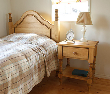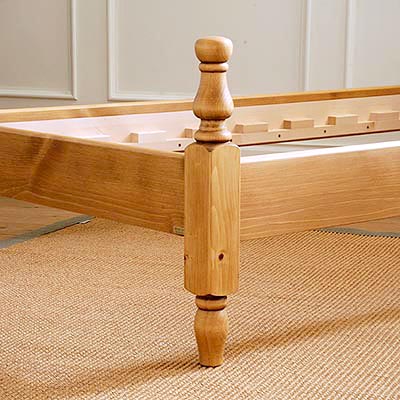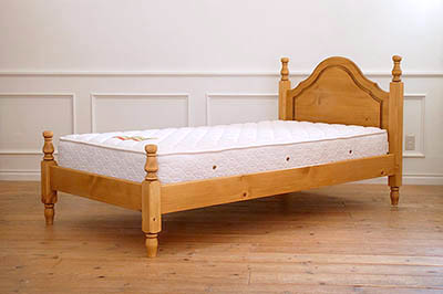 特徴的なコーナーポストのデザイン(ろくろ加工)も国内で再現。 高さを少し低くした分、足下にスッキリとシェイプを入れました。 |