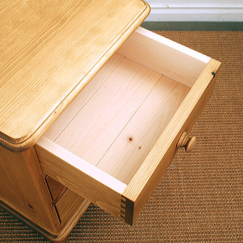 引き出しの内部、背板、脚に至るまで、全てにカナダ産ホワイトパイン材を使った「総無垢」仕様のミニチェスト。 |