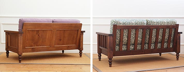 ![]() フレーム座面部は、スノコではなく強度の 高い全面張りにしています。 ソファクッションを外して、ベンチとしても使えます。 ※フレーム塗装色 3シーター、2シーター 「オールドパインカラー」 1シーター 「アンティークブラウン」 その他ワックスカラーお選びいただけます。 |